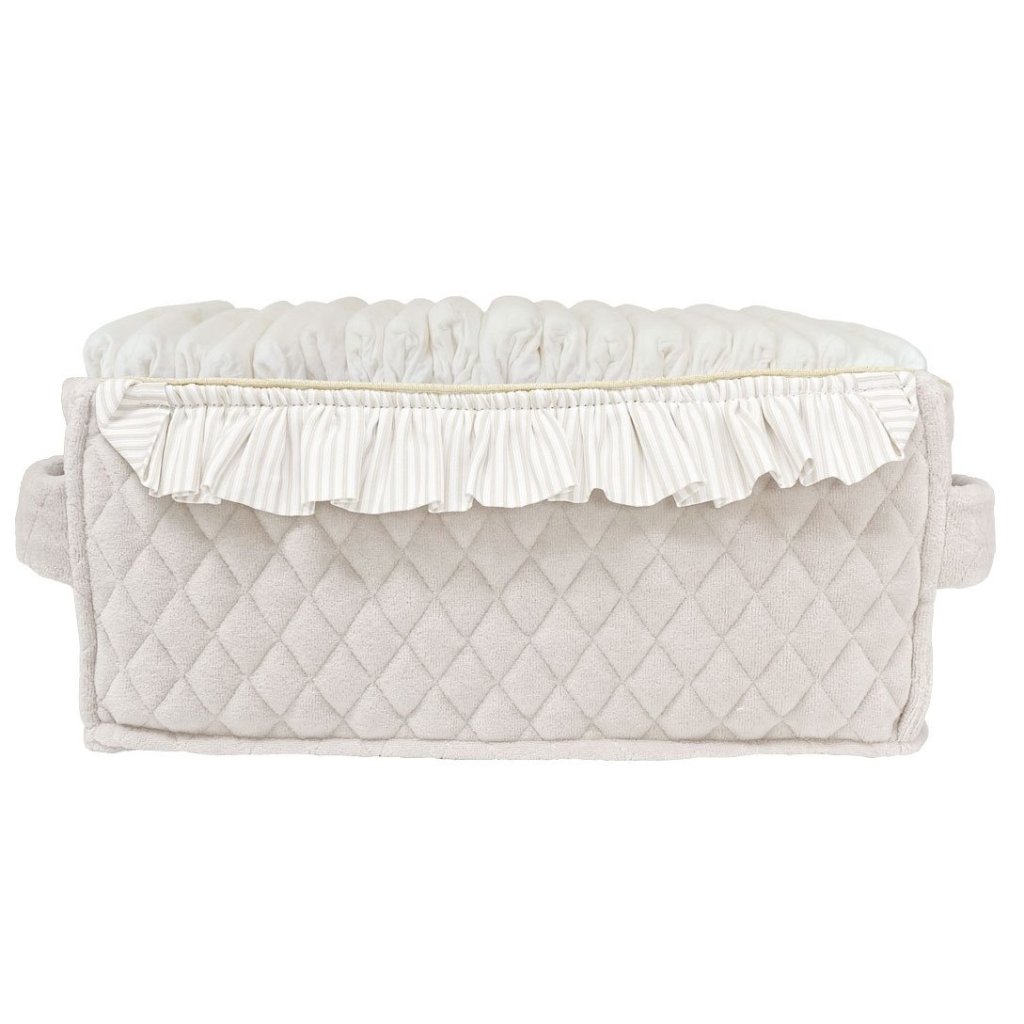 Krásny a funkčný box na plienky vyrobený z prešívanej bavlny v béžovej farbe a ozdobený rozkošným volánom. Jej tvar je prispôsobený tvaru a veľkosti plienok.