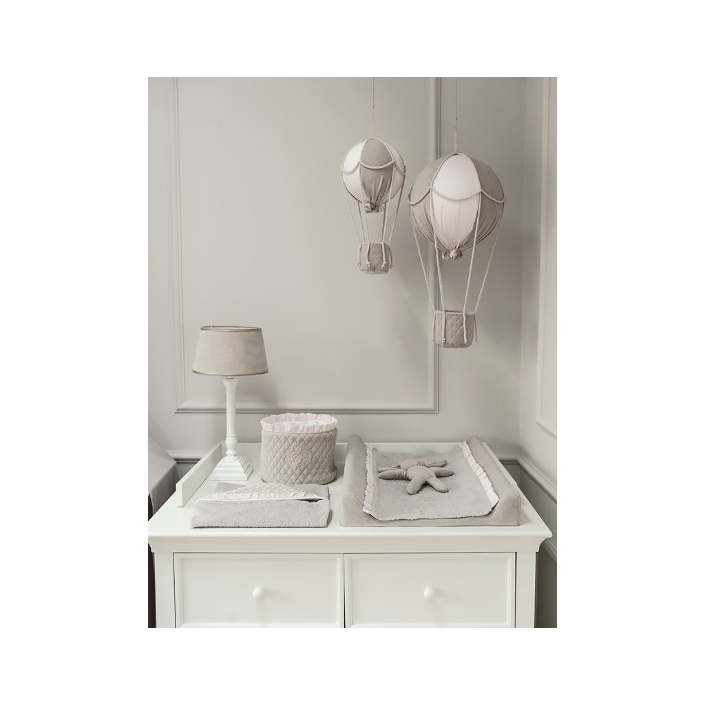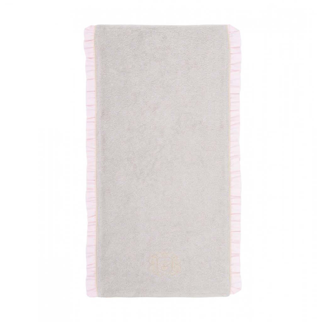 Náhradný poťah na prekrytie prebaľovacej podložky. Vyrobený z béžovej froté bavlny so zlatým znakom, rozkošným riasením v ružovej farbe so zlatým lemom.