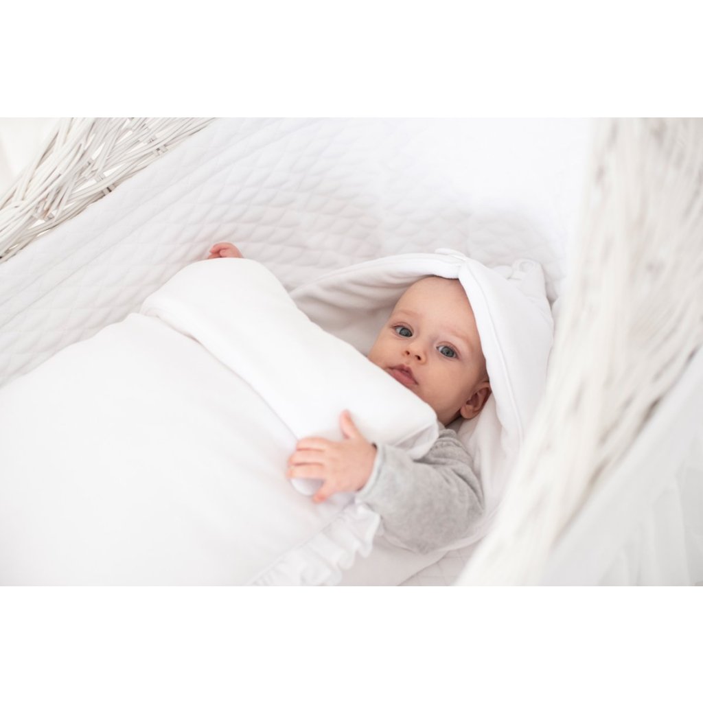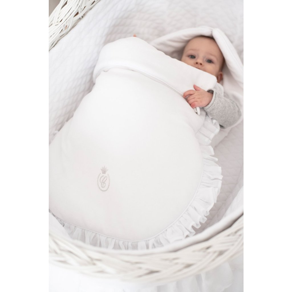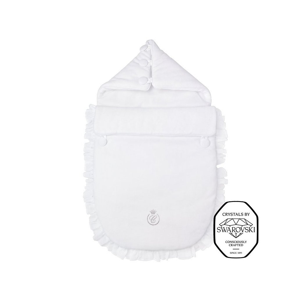 Zabaľte svoje bábätko do kráľovského pohodlia a jemnosti. Caramella perinka Royal s kryštálmi Swarovski® je stelesnením luxusu, ktorý spája bezpečie, eleganciu a teplo v jednom výnimočnom kúsku. Je vyrobená z hebkého bieleho velúru, zdobená priesvitným volánom a originálnymi kryštálmi Swarovski® – pre dokonalé chvíle s vaším pokladom. V zadnej časti perinky sú špeciálne otvory, ktoré vám umožňujú perinku používať v autosedačke.