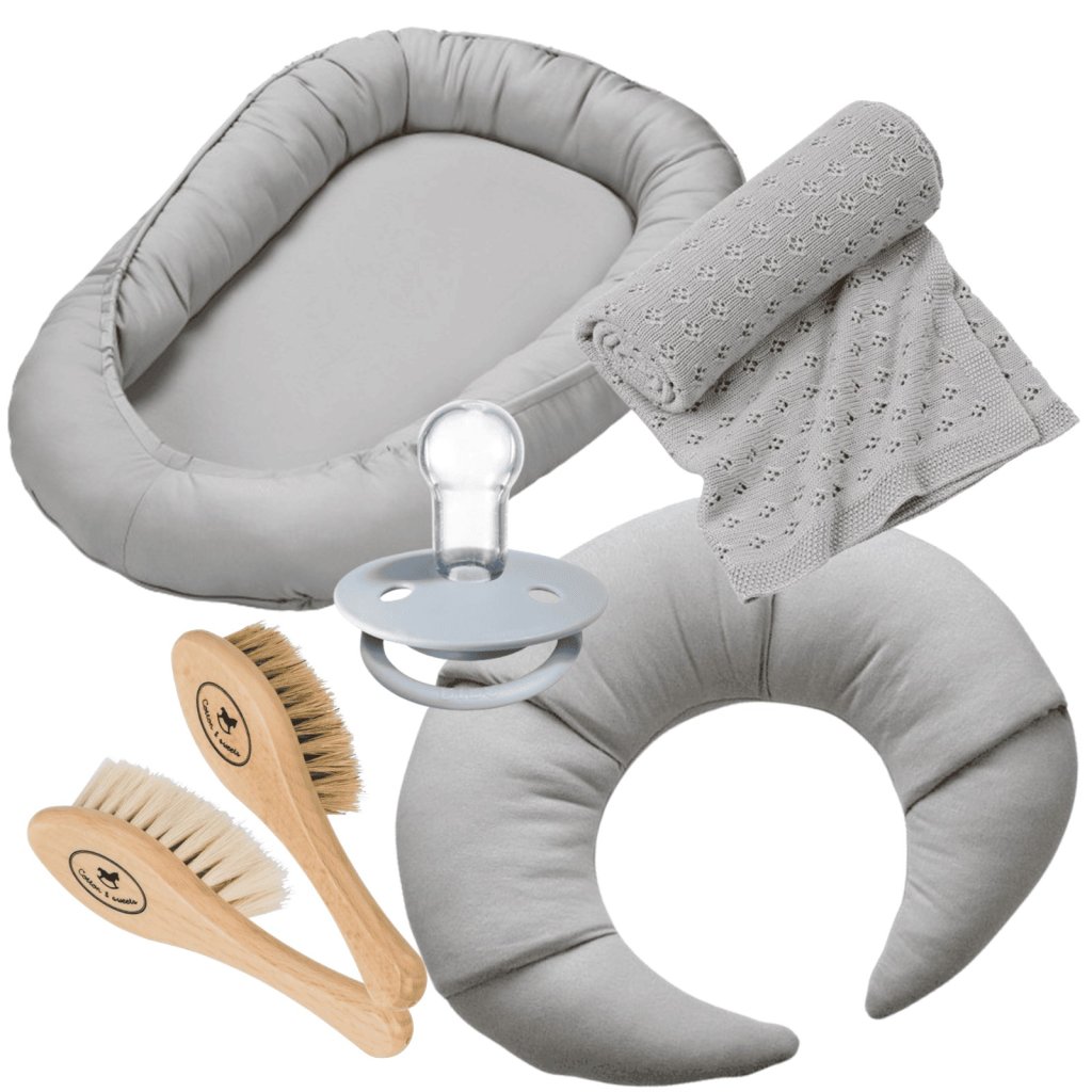 SADA obsahuje: hniezdo, dojčiaci a tehotenský vankúš, detskú bambusovú deku, cumlík, relaxačnú kefu, vyčesávaciu kefu.