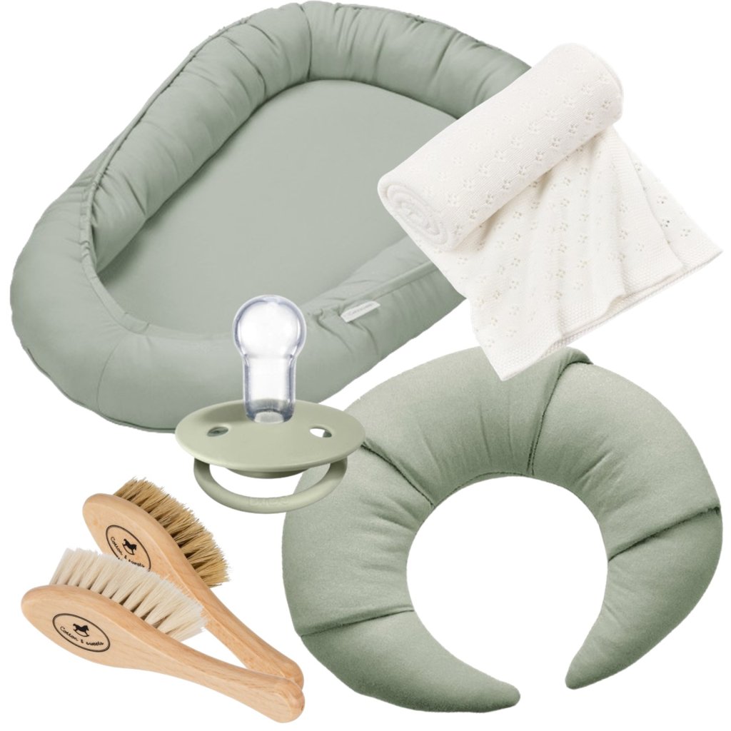 SADA obsahuje: hniezdo, dojčiaci a tehotenský vankúš, detskú bambusovú deku, cumlík, relaxačnú kefu, vyčesávaciu kefu.