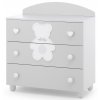 Praktická detská komoda s 3 priestrannými zásuvkami. Ku komode odporúčame dokúpiť prebaľovaciu podložku alebo externý drevený rám na PVC podložku. úchytky na skrini sú v tvare guľatej úchytky.