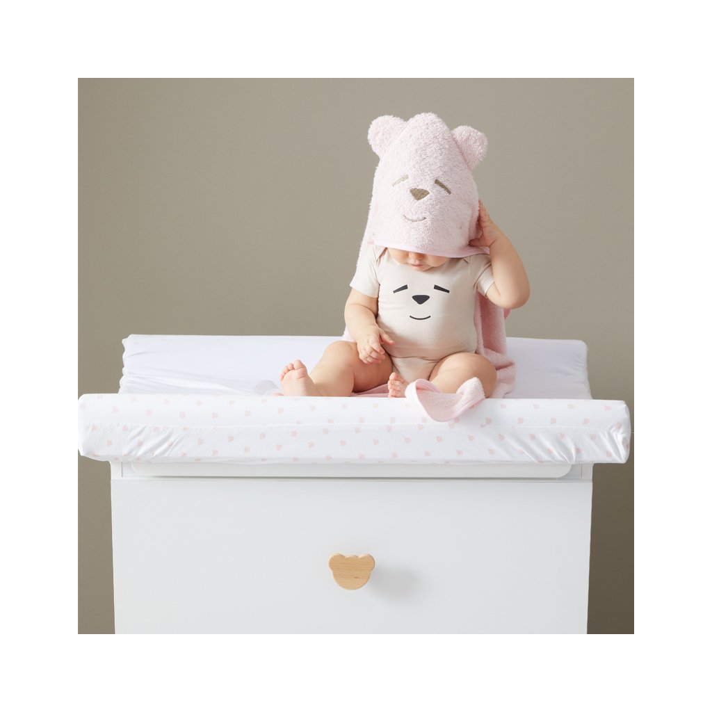 Pult je veľmi pevný a umožňuje pohodlné prebaľovanie až do 12 mesiacov bábätka. Na vrchnej časti pultu je mäkká PVC podložka v bielej farbe, ktorá je vybavená dvoma vyvýšenými bezpečnostnými stranami. PVC prebaľovacia podložka je na pocit chladná, preto odporúčame dokúpiť si bavlnený alebo froté poťah, resp. bavlnené mušelínové plienky, ktoré sú z príjemných a hrejivých materiálov, čím sa zabezpečí dokonalý komfort pri prebaľovaní bábätka.